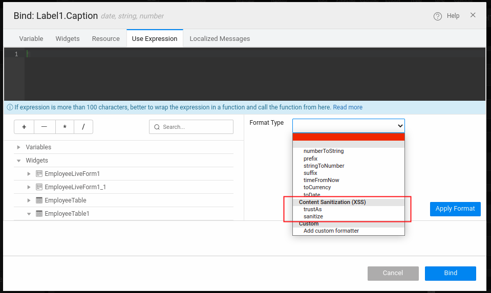 The default behavior of WaveMaker UI widgets is to sanitize the content rendered inside them, preventing any possibility of an XSS vulnerability in the app. However, if the developer wants to bypass sanitization in the widgets, the Formatters trustAs can be used at the time of binding data to the widgets.