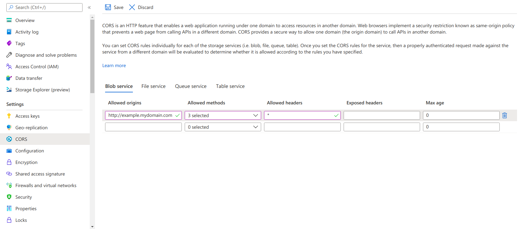 • Enable CORS If the web application is loaded in one domain and the frontend code in the Azure storage container is loaded with a different CDN domain.In the Azure storage account select CORS under settings to enable.