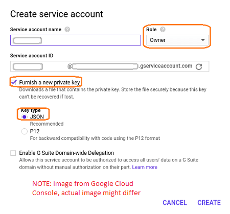 • A downloaded file containing Private Key in JSON format (following shows the setting from the Google Create Service Account dialog. This dialog might differ from the actual one)
