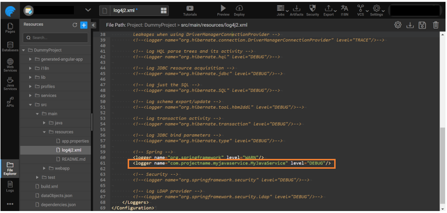<logger name="PackageName.JavaServiceName" level="DEBUG"/>