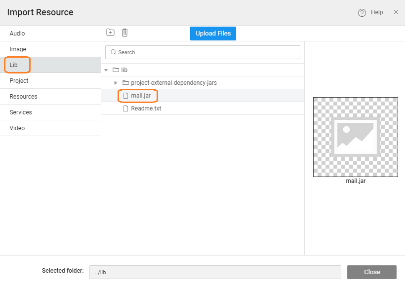 1. Import Resource, and select the Lib folder to place the jar file to be imported. As an example, we are using a mail file.