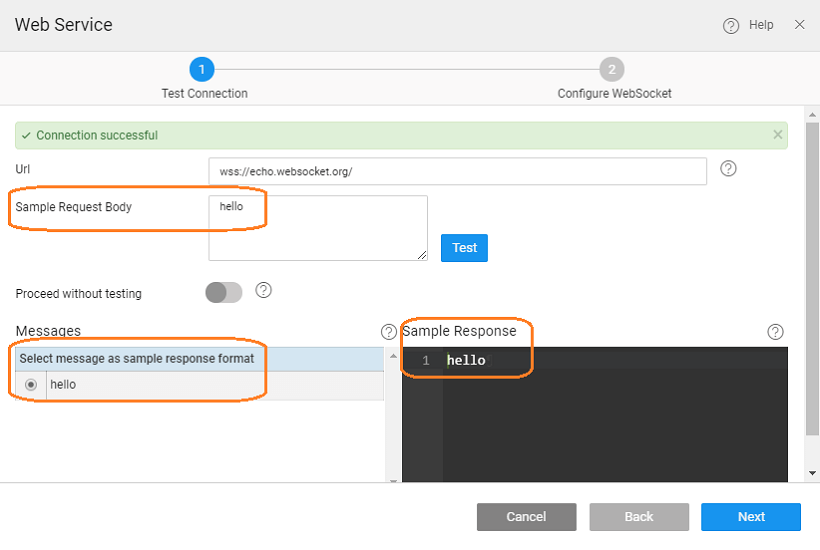 Since WMO is hosted on https, a WebSocket service on ws:// protocol cannot be tested because of security limitations on browsers. To cater this, the platform detects if the URL entered by the user is on ws:// protocol and throws a warning to the user with a message. At this point the TEST button is disabled. You can still proceed, however, by checking the Proceed without Test option. You can check this flag, provide sample Request Body and Sample Response and proceed to config screen without testing.