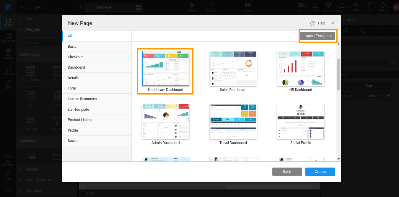 11. From the New Page Dialog, you can Import Template and apply it to the page. You can see the Thumbnail and Preview the Template.