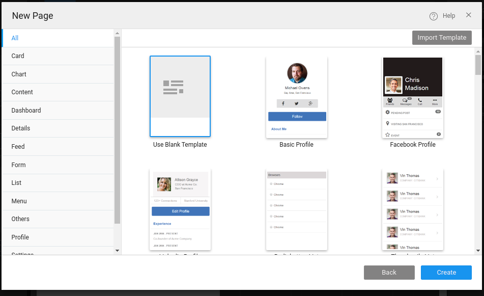 • For developer convenience, the Templates are categorized as Travel, Basic, Sales, Healthcare, General, Finance, Human Resources, Social, Admin, and E-Commerce. For Hybrid Mobile Apps these templates are categorized as a card, chart, dashboard, menu etc.