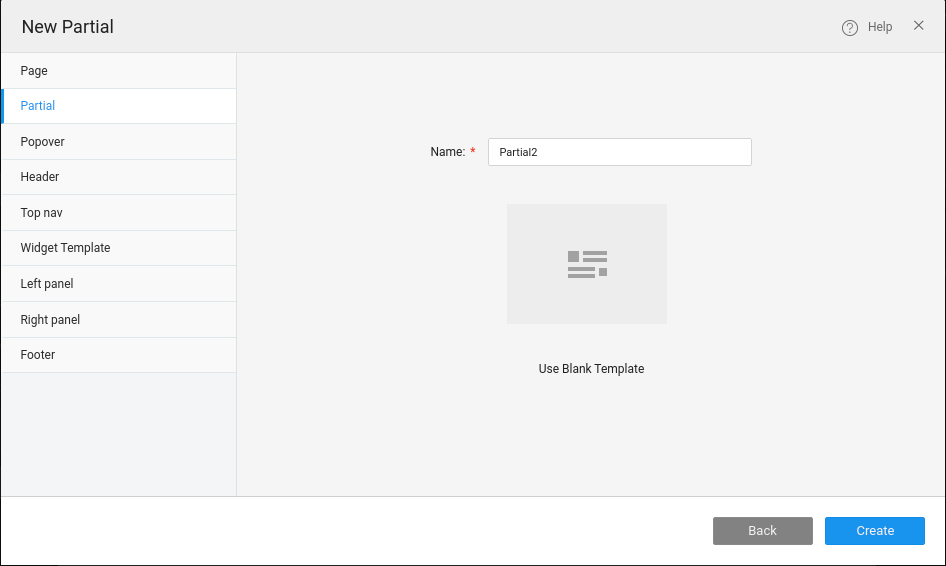 • For Hybrid Mobile, the available options are - partial or default, leftnav and popover.