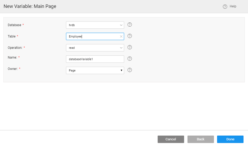 Database CRUD Variable connects to an individual database entity through auto generated CRUD APIs. It contains the values from the specified database table and controls such as Live Form require a Database CRUD Variable as input.