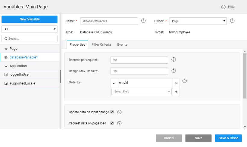 We can also specify the filterFields and orderBy options while invoking the variable. In the below example, the variable will get all the records satisfying the condition deptId==1 & empId>1, and also with the specified sort order. Please refer the Filter Conditions doc for the list of available matchModes.