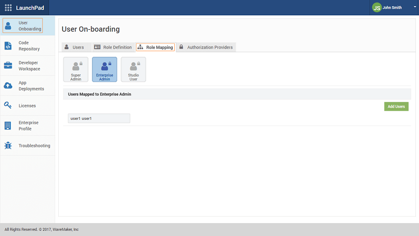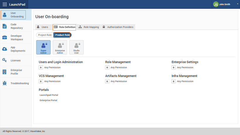 Launchpad Role Definitions: Roles can be created from the Role Definition tab of the User On-boarding section of Launchpad. As mentioned earlier the Product Roles are pre-defined with permissions set and they cannot be modified. Project Roles come with a pre-defined roles of Project Admin, Project Developer and Default. Custom Project Roles can be created and Permissions allocated to them as per the requirements. From the Role Mapping tab users can be assigned to Super Admin, Enterprise Admin and Studio User.