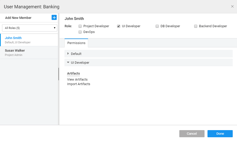• Default: This is the default role when a user is assigned to a Project. This includes only view privileges.