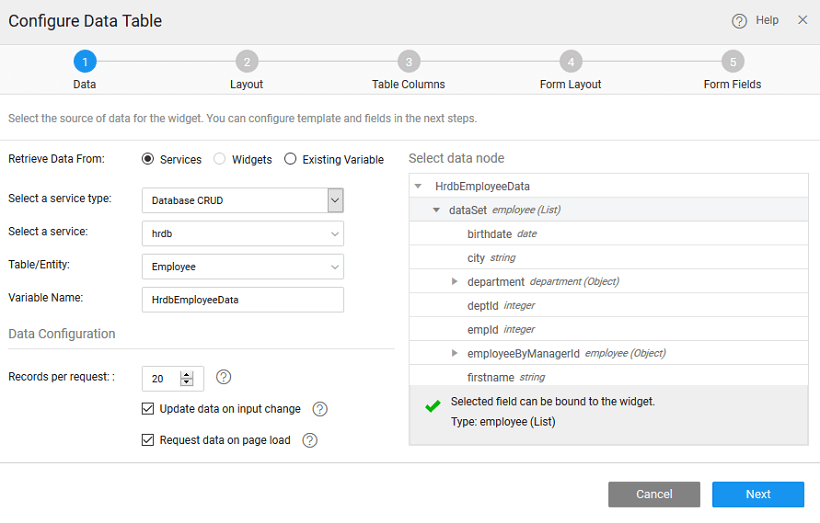 There can be different scenarios to deal with when configuring your Data Table Widget with a data source. The data source can be in the form of a service like Database or web or Jave service or from an another widget on the page.
