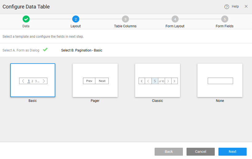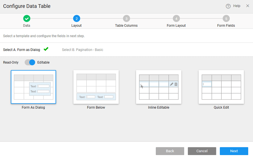If you have selected any of the Data Table layouts that include an inline or a dialog Form this step will allow you to select a Form layout for your inline Form or dialog Form.