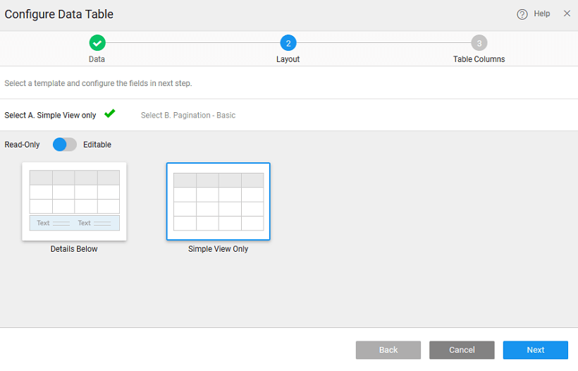 If you select the Data Table layout without Form in step 2, the Done button appears after this step. Click the Done button to add the Data Table to the current page. If you select other layouts, then additional two steps to do include select the Form layout and select the Form fields.