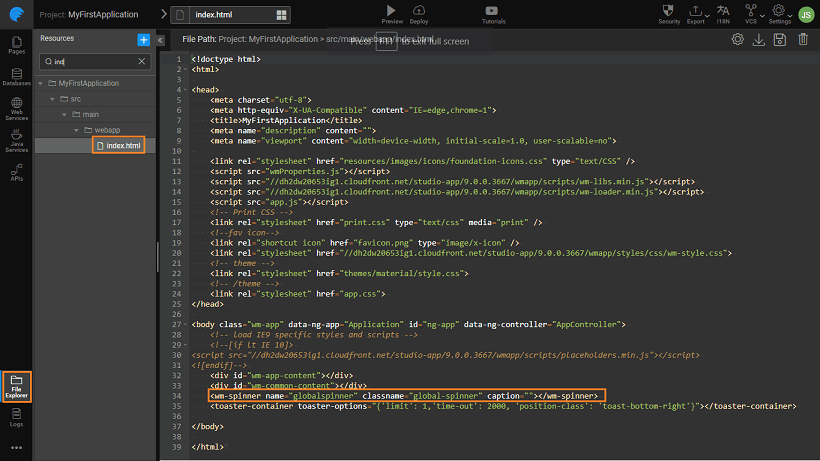 1. From the left pullout menu Files tab, select Project from the drop down, and locate index.html.