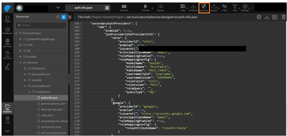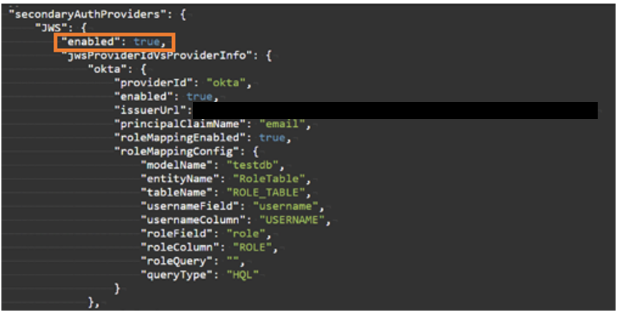 Configure a role table and once the token is authenticated the current logged-in user role is retrieved from the database. Add the modelName, entityName,tableName, usernameField, usernameColumn, roleField, roleColumn or roleQuery, queryType in the JSON structure as shown below for the Okta provider.