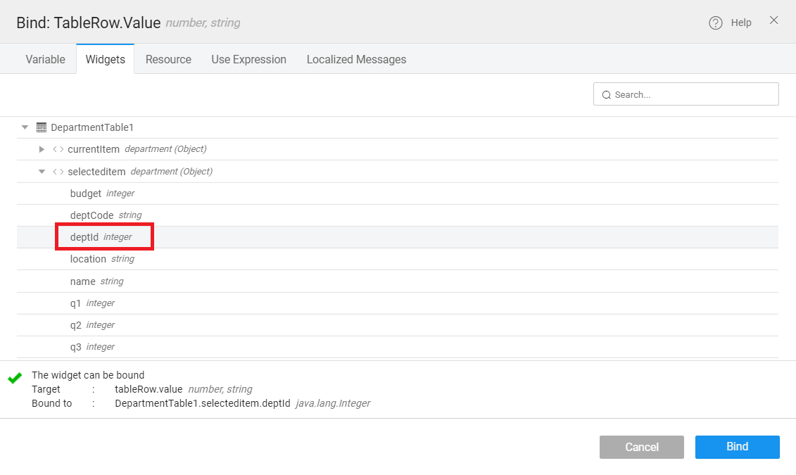 • Go to the Widgets tab → DepartmentTable → selecteditem → deptid integer → click Bind.
