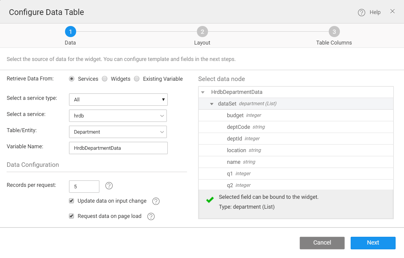• Table/Entity → Department → A variable will be created automatically, for example, HrdbDepartmentData.
