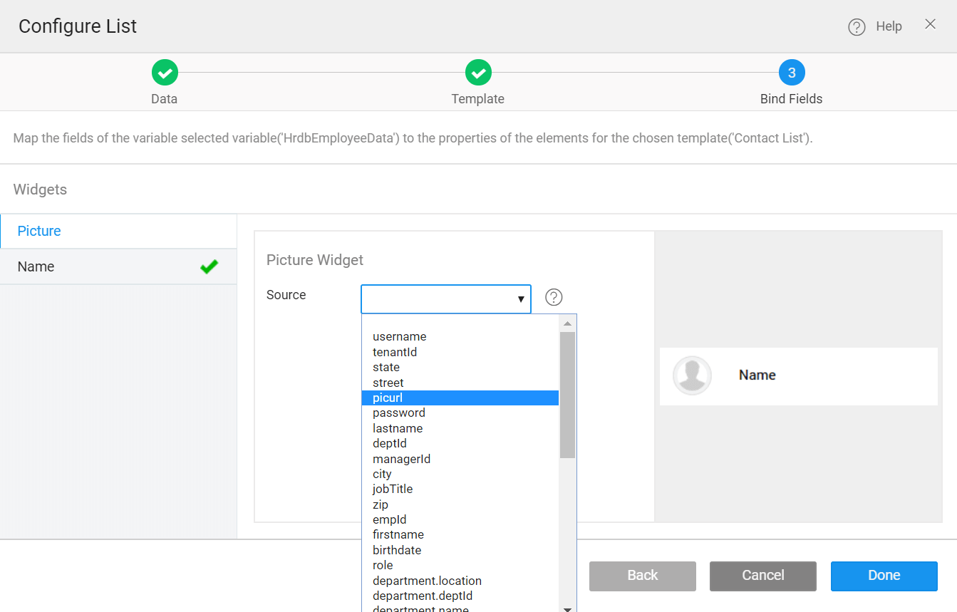 • In the next window, bind the data source for the picture widget and name widget.
