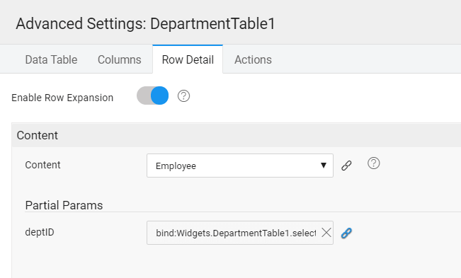 • Partial Params → deptID → click on the Bind Property icon.