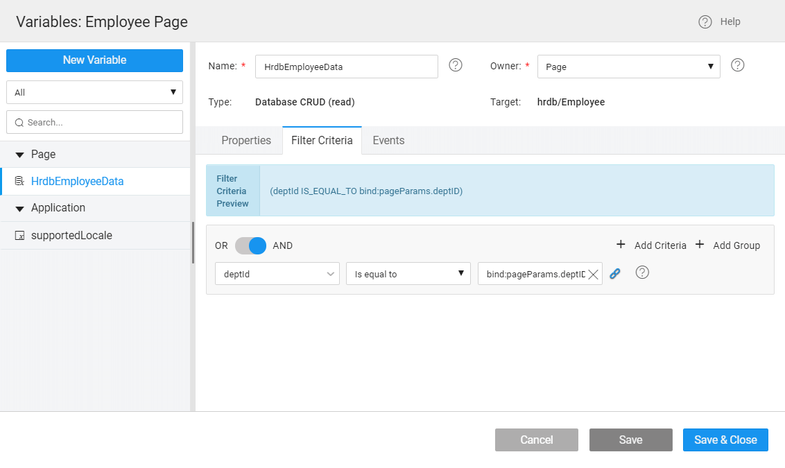 Now, set filter criteria in the variables for HrdbEmployeeData to deptId Is equal to _bind.pageParams.deptID, _as shown in the image below: