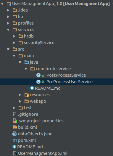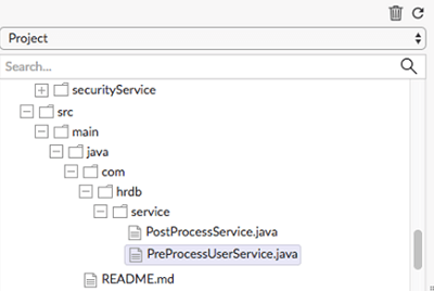 • Create a service in user src/main/java folder of the project Example: UserManagementApp/src/main/java/com/hrdb/service/PreProcessUserService.java