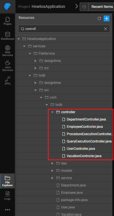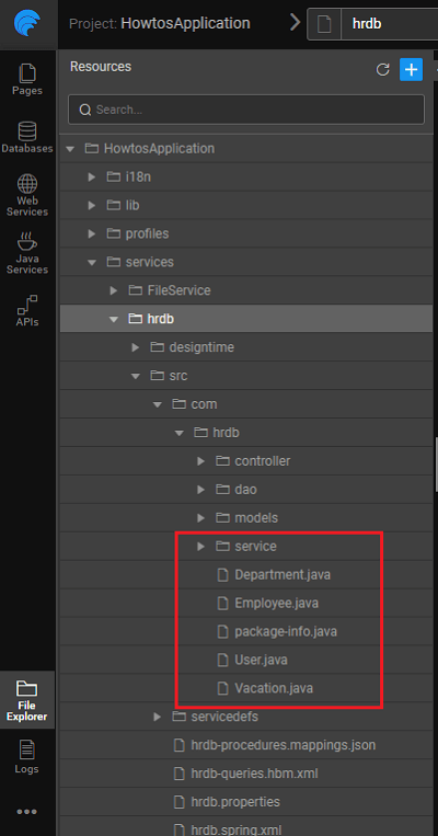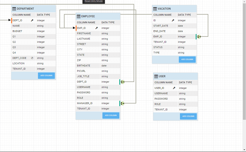 When a database is imported into a WaveMaker app, Java code with Spring based REST APIs for all CRUD operations on each database entity are generated. Generated APIs include endpoints to search(filter), get count of and export data. WaveMaker also understands the relations across the tables and generates the associated APIs as well.