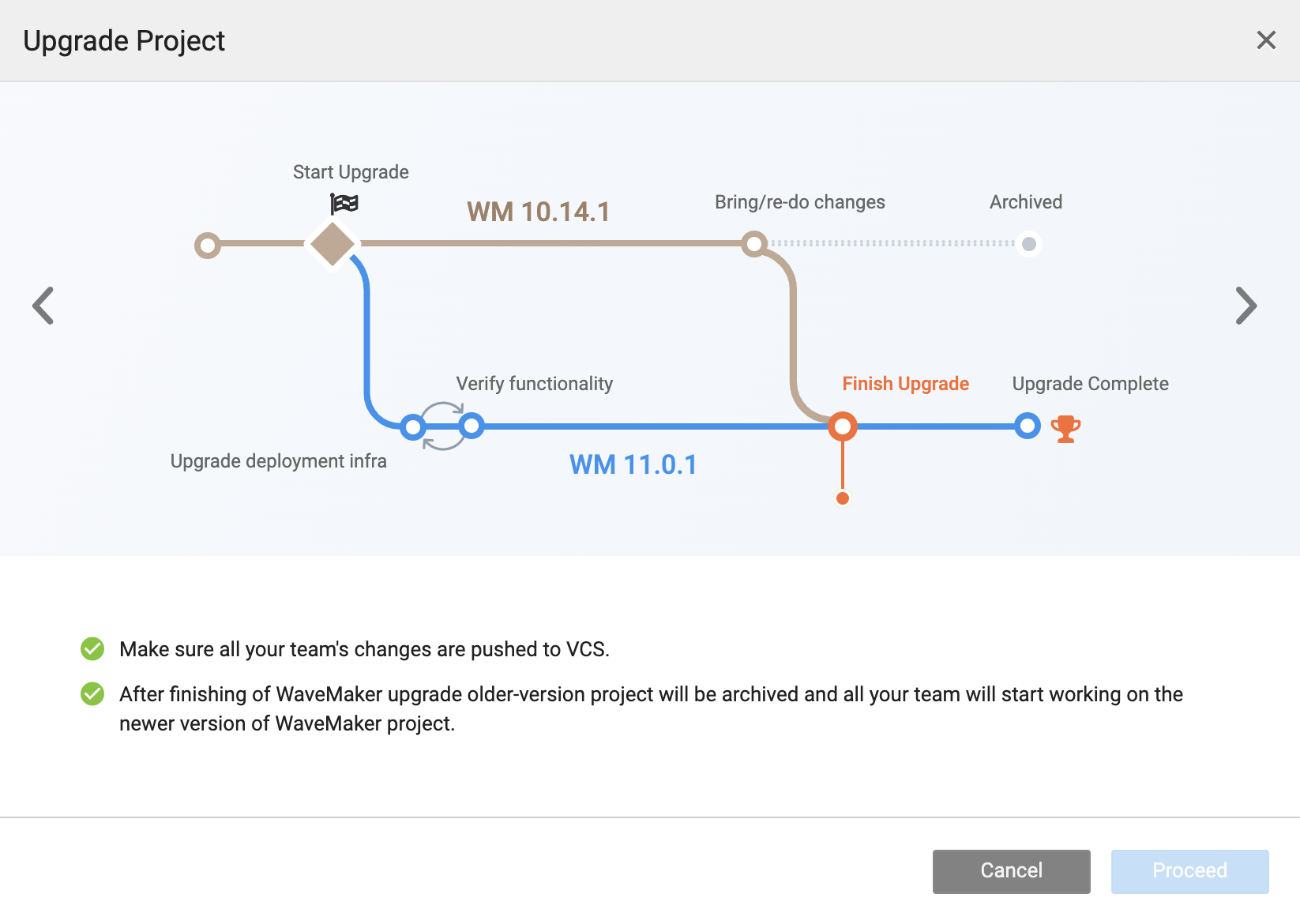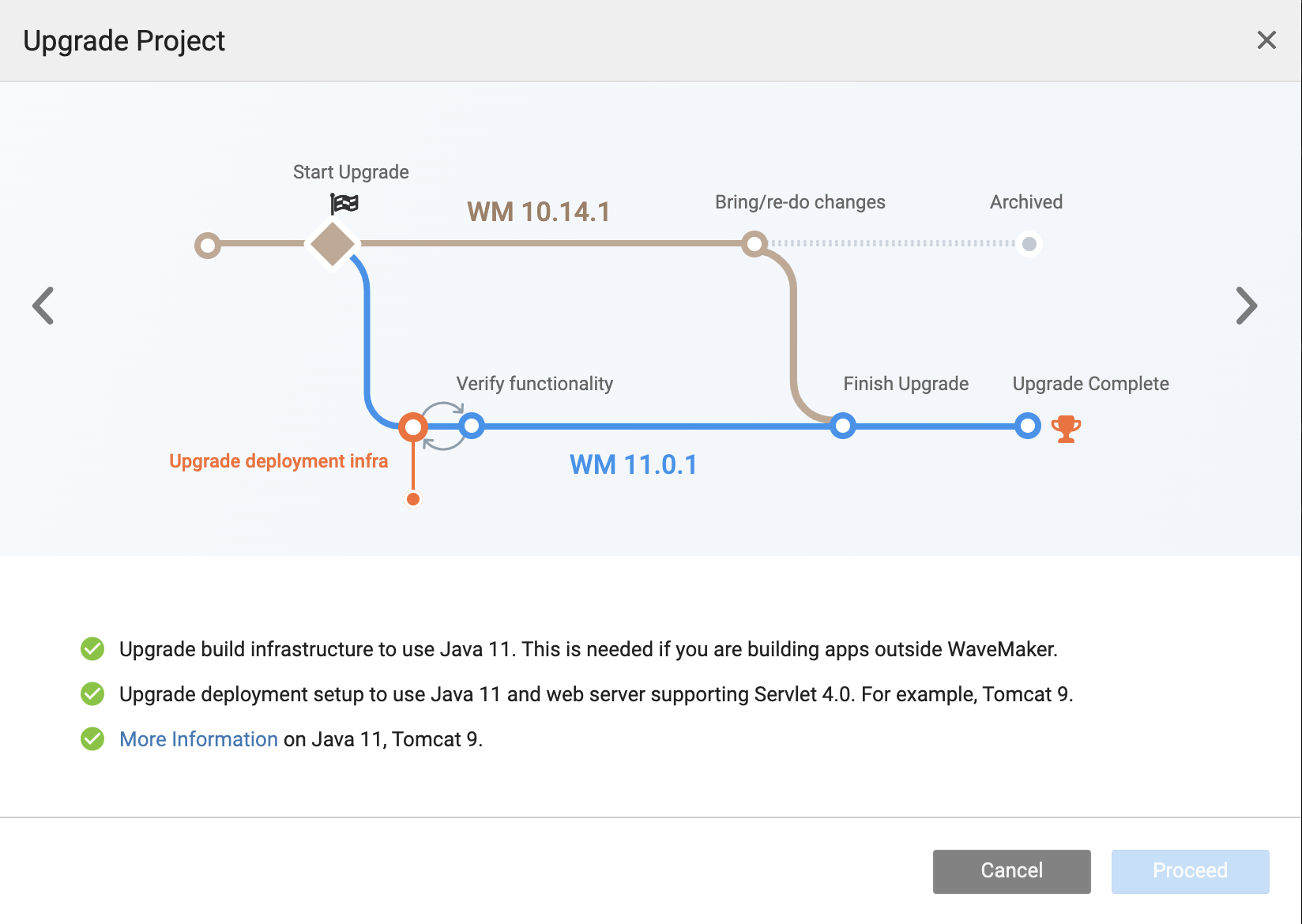 This guide helps you follow step-by-step instructions for upgrading your projects to WaveMaker 11.x. Follow these steps carefully and ensure you test the project thoroughly to complete the version upgrade. After finishing the upgrade, access all the amazing tools and features of WaveMaker 11.x. See WaveMaker 11 Beta Features to learn what's new.