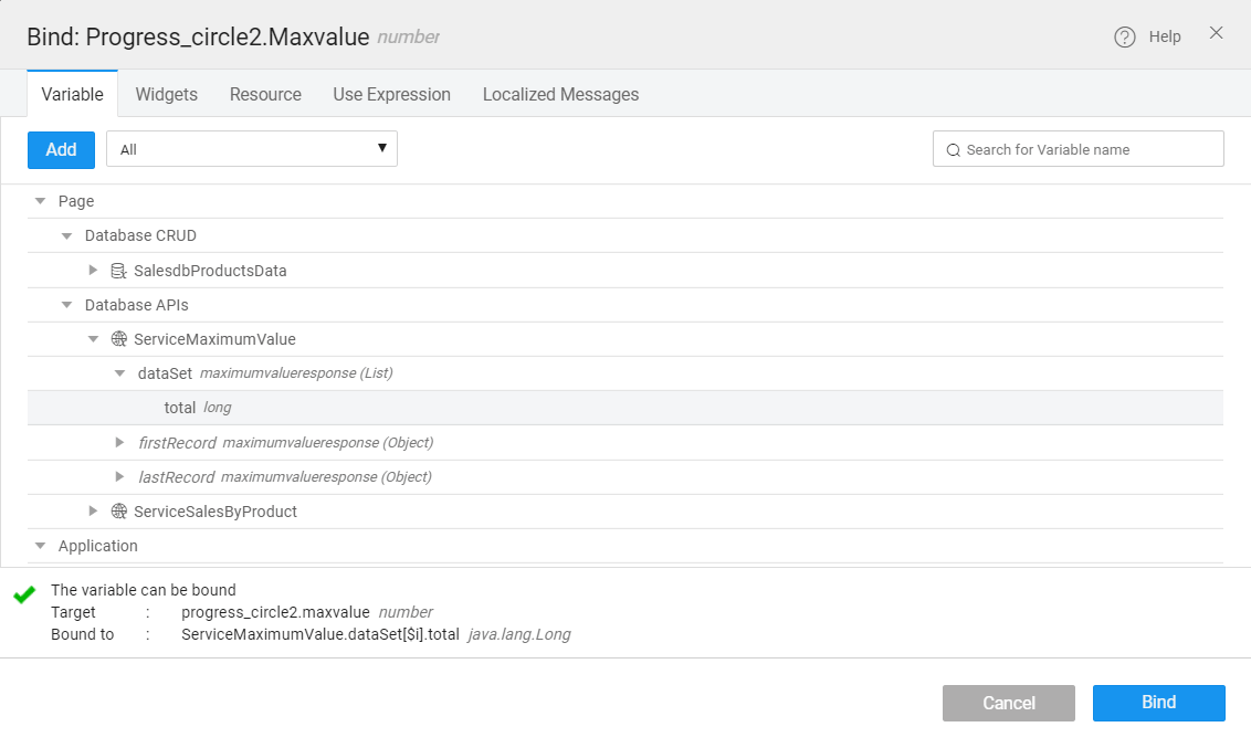 To use the progress circle widget for static data, you enter values in the widget properties for default, min and max values. Also, you can execute SQL queries from the database and generate database APIs to get dynamic values; bind those values for default, min and max values in the widget properties to visualize the status or the data.