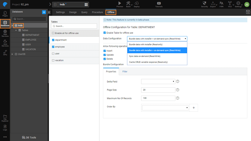 If a table has to be available in offline, select the table and then check the flag ‘Enable Table for offline use'.