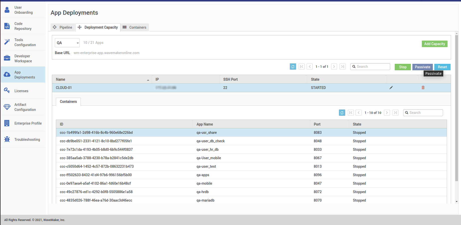 Passivate Containers in StudioWorkspace/AppDeployment Instances