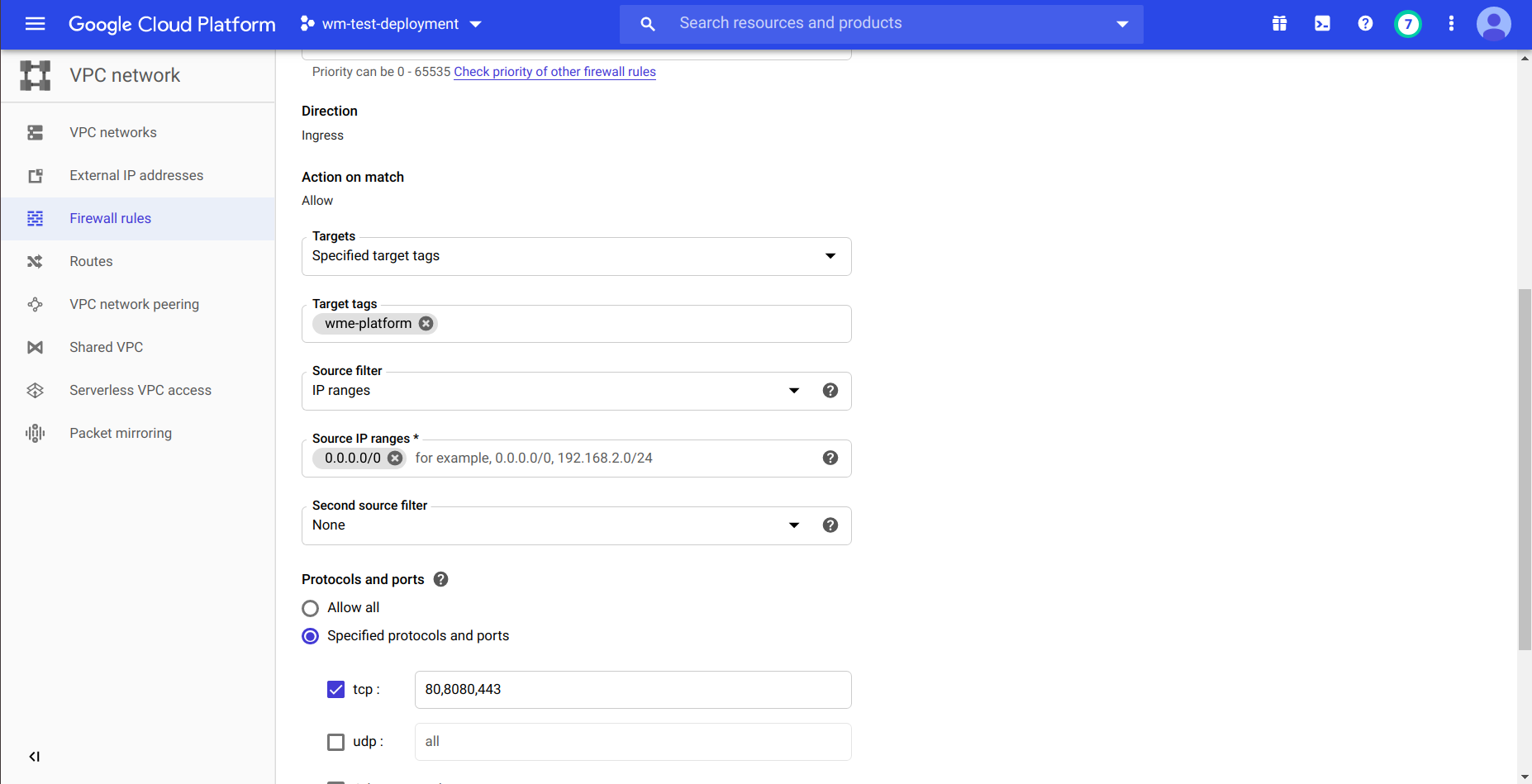 • Select target type and source filter type.by using the target we can connect the firewall rule to Instance. example the which Instance have target tag the firewall is connect to that Instance and by using the source we can open ports to specific Instance. example the which Instance have a source tag the ports will be open to that Instance. we provide this tags at network section during the Instance creation.or else you can select your own Target and Source methods.