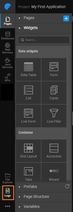 Log files can be accessed from the project workspace footer area. There are types of logs that are recorded - Server, and Application. These can be accessed from the Developer Utilities menu for an application.
